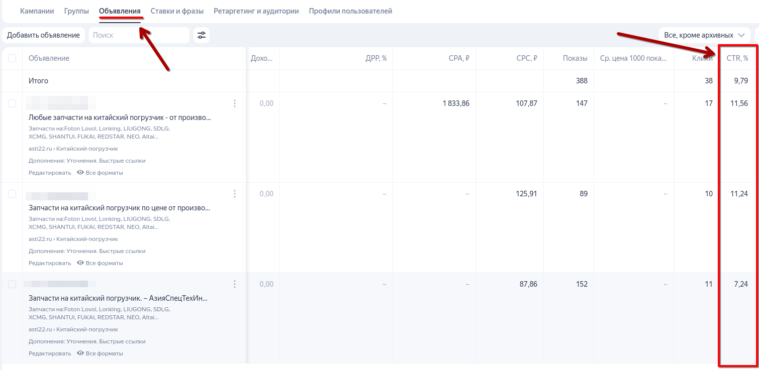 - Не забывайте оптимизировать объявления, так как от этого зависит частота переходов по рекламе. Ориентируйтесь на показатель CTR%. В каждой нише этот показатель будет индивидуальным и также зависит от настроек вашей кампании и групп. Старайтесь улучшать объявления, чтобы увеличить этот показатель.