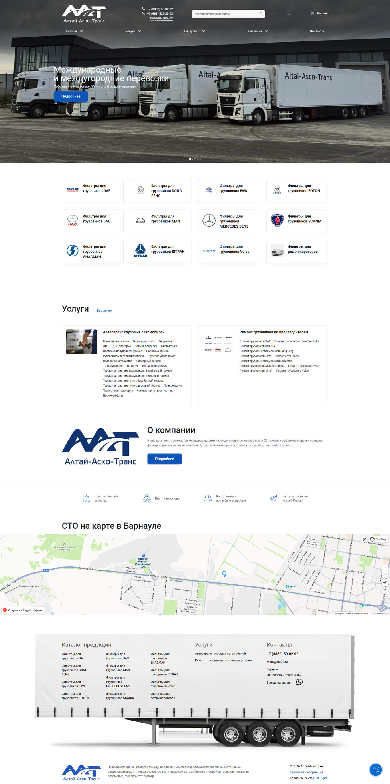 С 2023 года являемся дистрибьюторами фирмы Kang Wang, производящей фильтры для грузовых автомобилей. Полный ассортимент продукции представлен у нас в интернет-магазине. В 2023 году принято решение о строительстве сервисной автобазы, на которой будет производиться ремонт, обслуживание, мойка и технический осмотр грузовых автомобилей. Открытие автобазы планируется в сентябре 2024 года. С 2021 года ООО «Алтай-Аско-Транс» действующий член АСМАП.