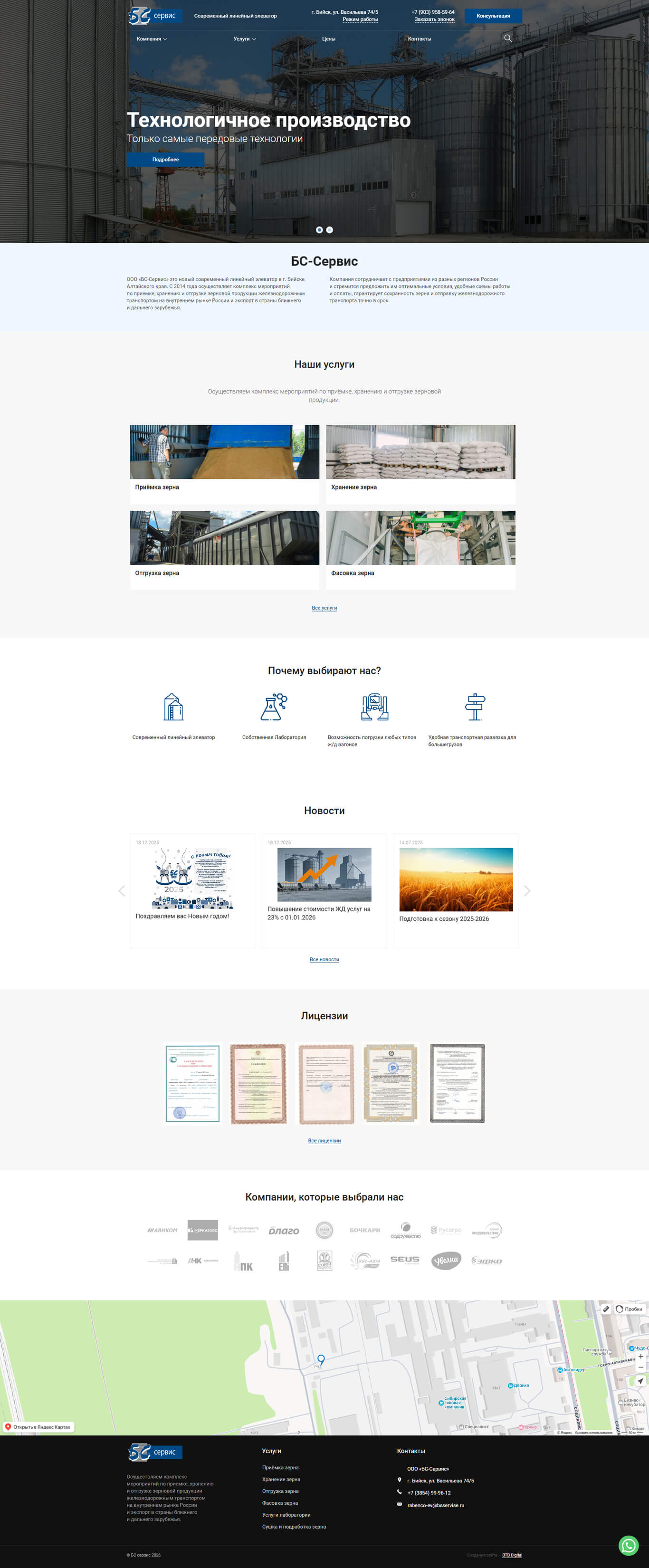 Разработали сайт для компании «БС-Сервис», специализирующейся на приёмке, сушке, хранении, фасовке и отгрузке зерна. Сайт обеспечивает простой и удобный доступ к информации о всех услугах компании, позволяет оперативно связаться с менеджерами и оформить заявки. Дизайн сайта современный и интуитивно понятный, а адаптивная верстка гарантирует комфортный просмотр на любом устройстве.