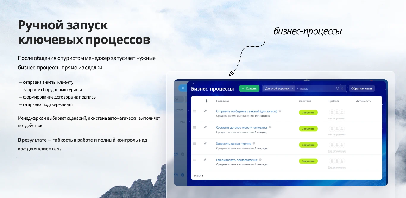 В результате менеджеры работают быстрее и увереннее, логистика стала системной, а взаимодействие с туристами — удобным и контролируемым. CRM начала реально помогать бизнесу: снизились потери клиентов, ускорилась обработка заявок и минимизировались риски ошибок при продаже туров.