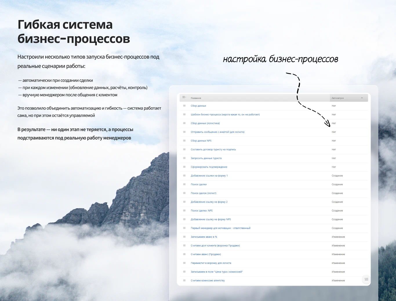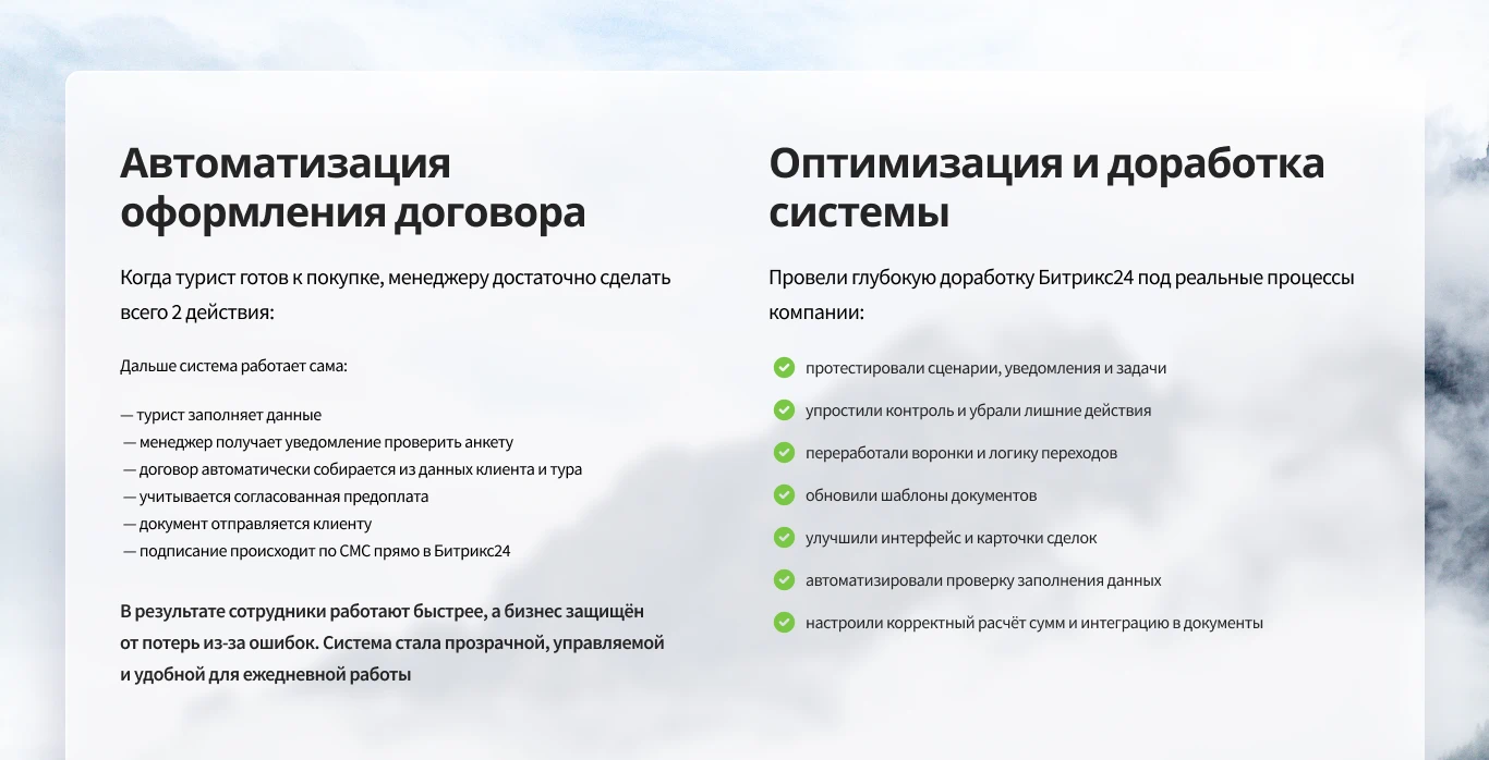 Для туристической компании «Два Алтая» мы провели комплексное внедрение и доработку Битрикс24, превратив CRM из формального инструмента в рабочую систему продаж. Переработали воронки, настроили бизнес-процессы, автоматизировали работу менеджеров и логиста, внедрили телефонию и коммуникации с клиентами в одном окне. Убрали лишние действия, сократили ошибки и сделали процессы прозрачными и управляемыми.