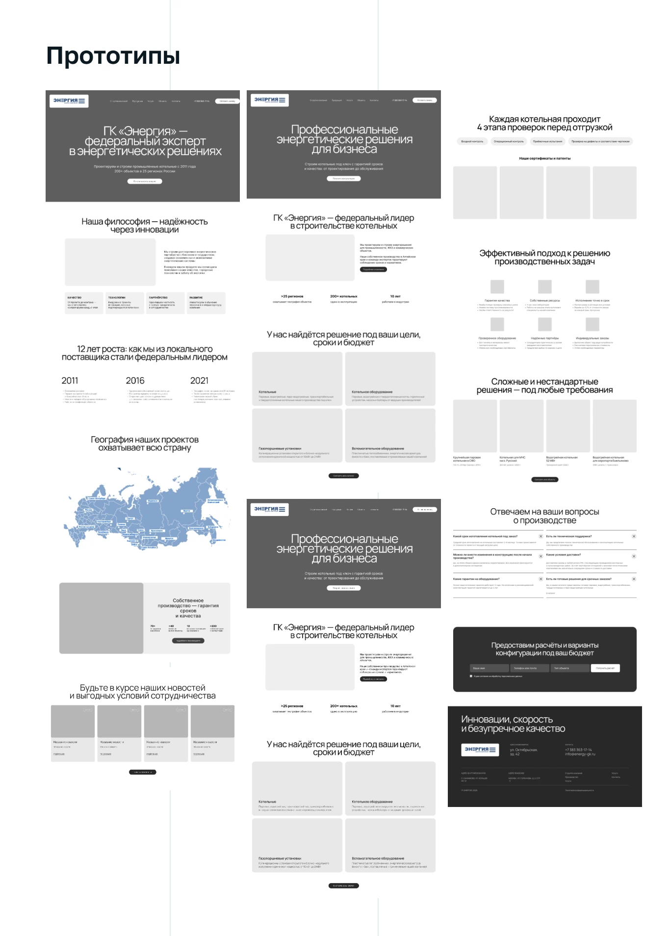 Сделали индивидуальный дизайн сайта для группы компаний «Энергия», одного из крупнейших в стране производителей паровых и водогрейных котельных. Сделали индивидуальную разработку для внутренних страниц сайта, в том числе отдельный дизайн страницы «Производство». Учли пожелания клиента при разработке функционала сайта и переноса контентной информации.