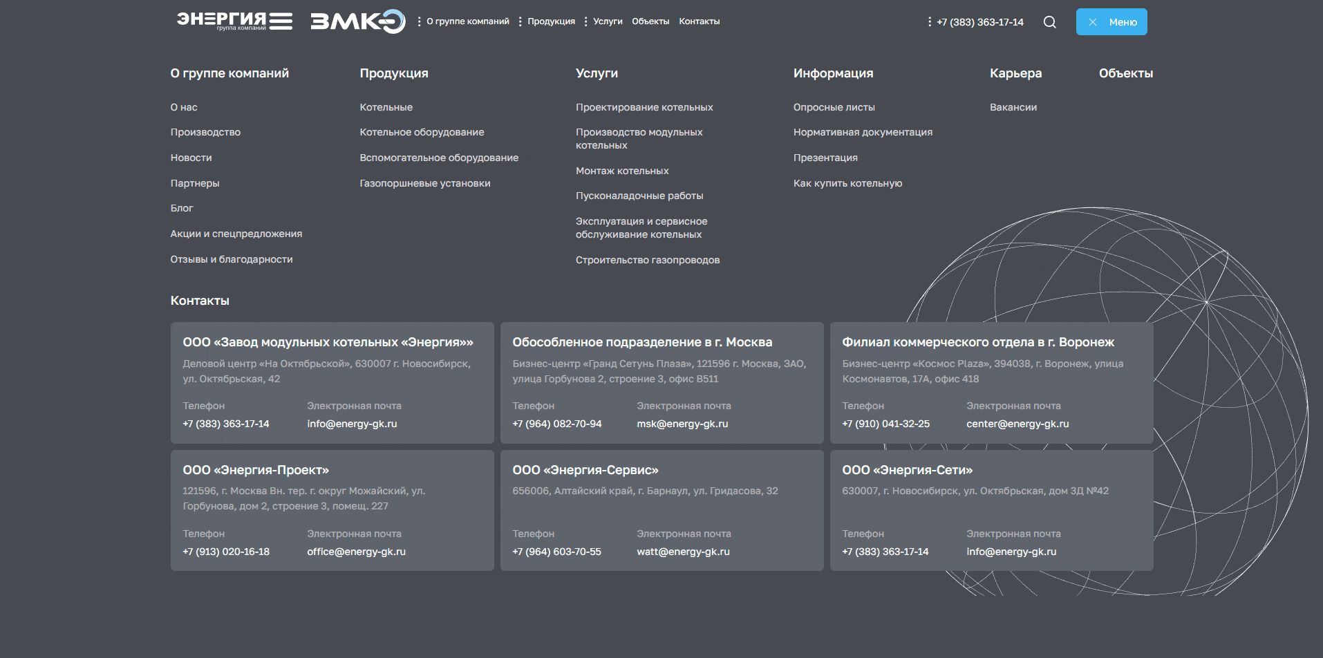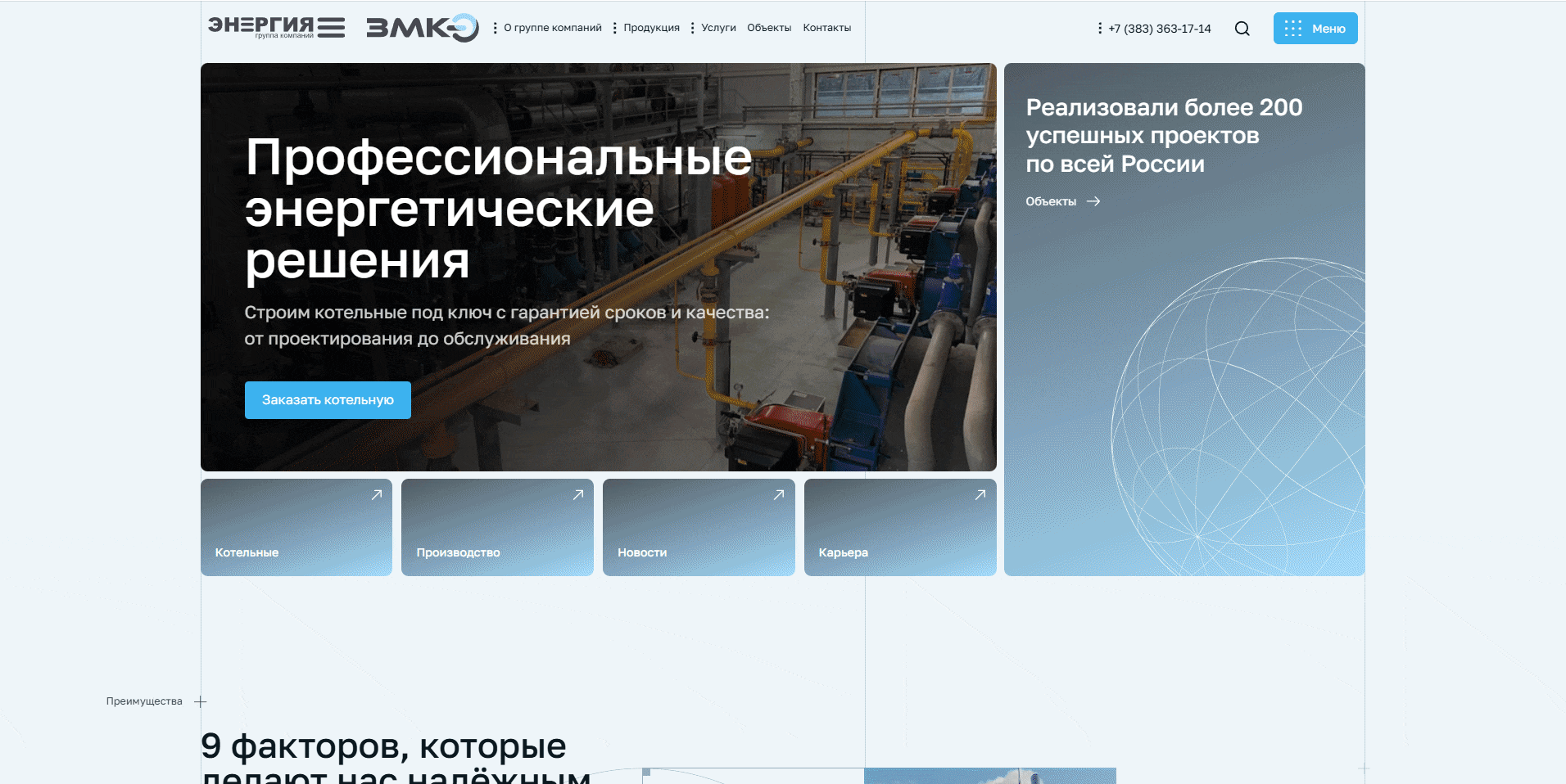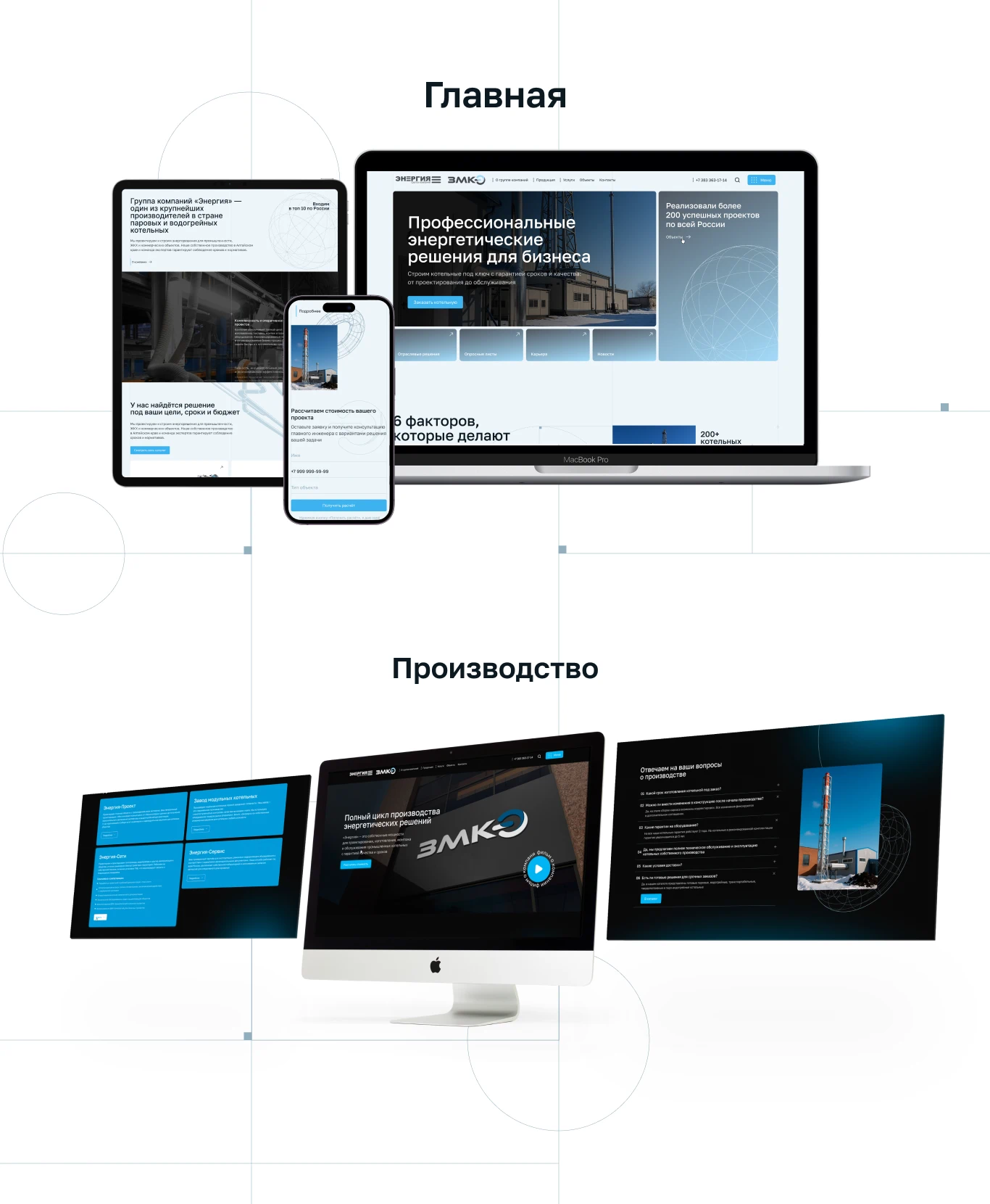 Сделали индивидуальный дизайн сайта для группы компаний «Энергия», одного из крупнейших в стране производителей паровых и водогрейных котельных. Сделали индивидуальную разработку для внутренних страниц сайта, в том числе отдельный дизайн страницы «Производство». Учли пожелания клиента при разработке функционала сайта и переноса контентной информации.