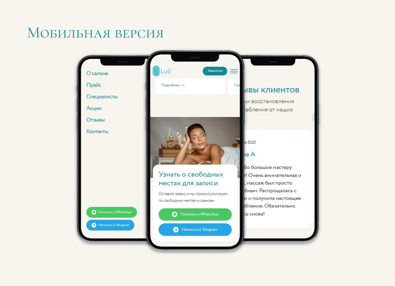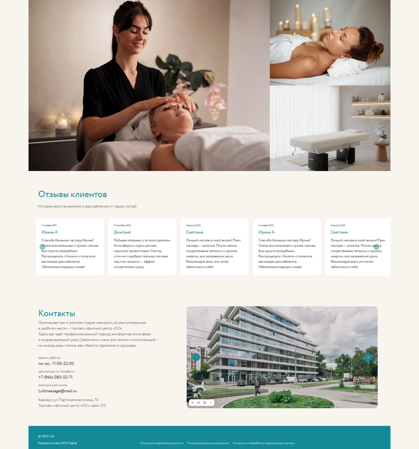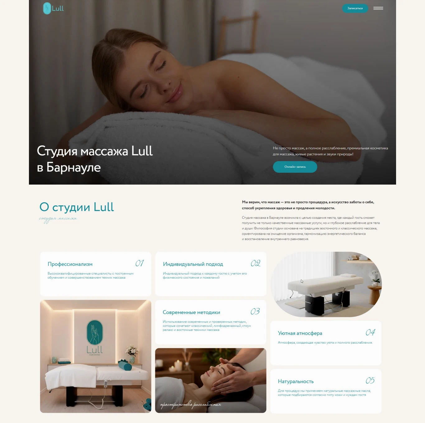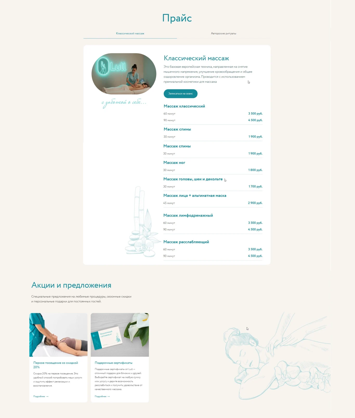 Сделали индивидуальный дизайн лендинга на конструкторе Tilda. Сформировали простой и понятный прайс на услуги, встроили виджет для записи на массаж. Также разработали логотип и подготовили варианты светодиодной вывески и постера для студии.