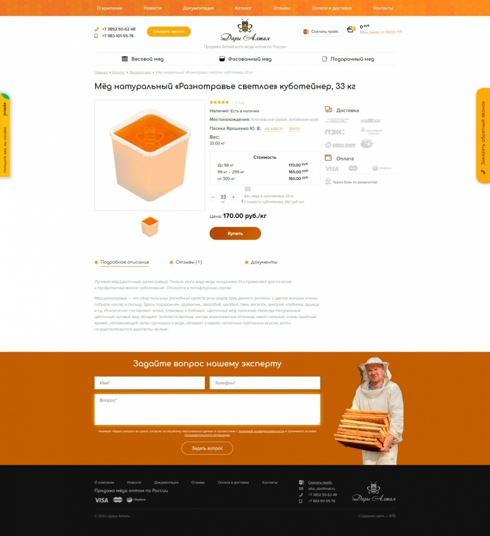 При разработке была учтена специфика клиента и разработан уникальный функционал для удобства оптовых покупателей. Например, оптовик сможет положить весовой мёд кратно куботейнеру 33 килограмма, при этом цена указана за 1 кг, и рядом указана стоимость тары. В другой рубрике, там где мёд продаётся коробками по 6 шт, он может складывать товар в корзину коробками по 6 шт, при этом цена указана за одну банку.